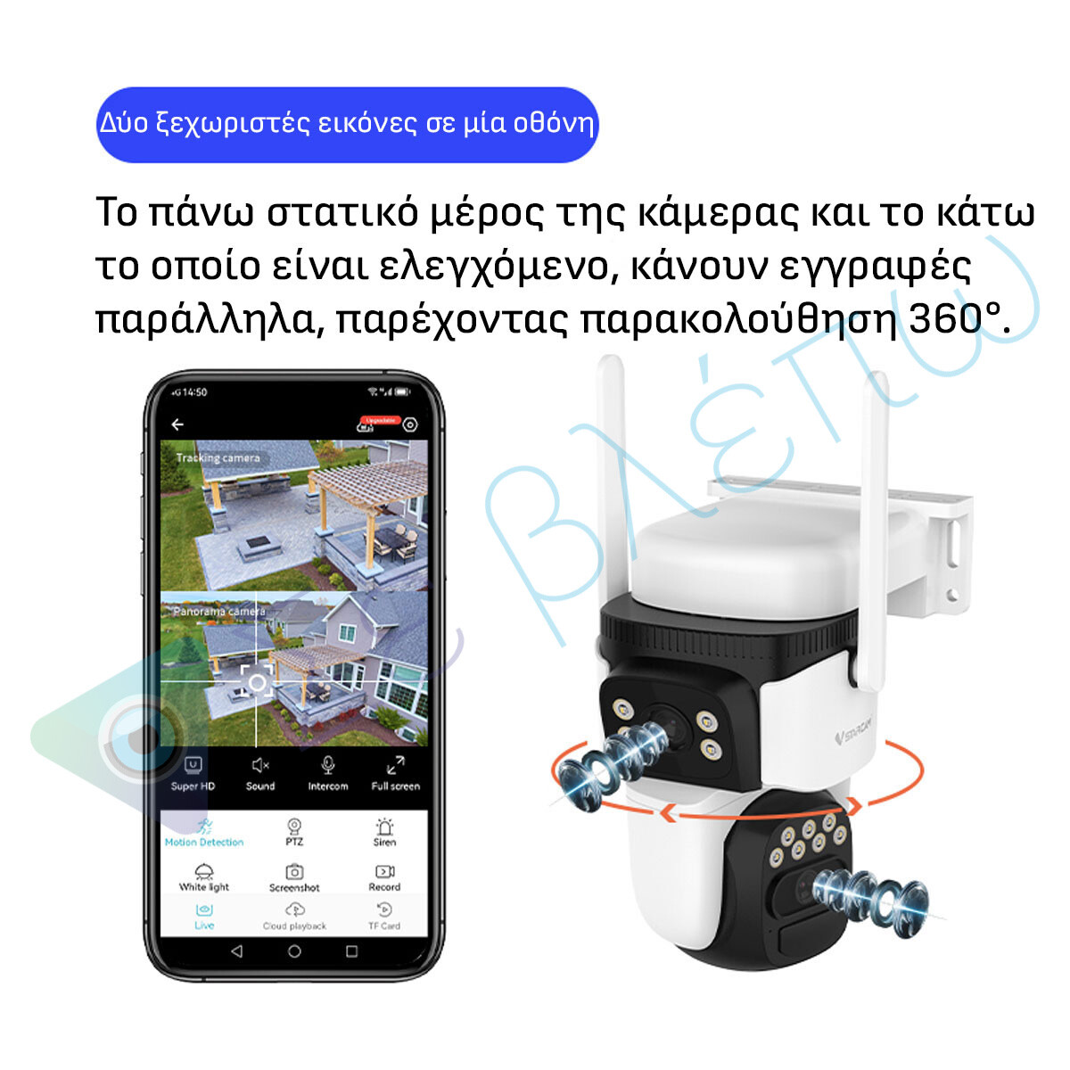 Η κάμερα διαθέτει μηχανοκίνητο περίβλημα ,το οποίο σας επιτρέπει να την περιστρέφετε οριζόντια και κάθετα. Αρκεί μόνο να σύρετε με τον δάχτυλο σας στην οθόνη του τηλεφώνου σας την επιθυμητή κατεύθυνση και η κάμερα θα γυρίσει.