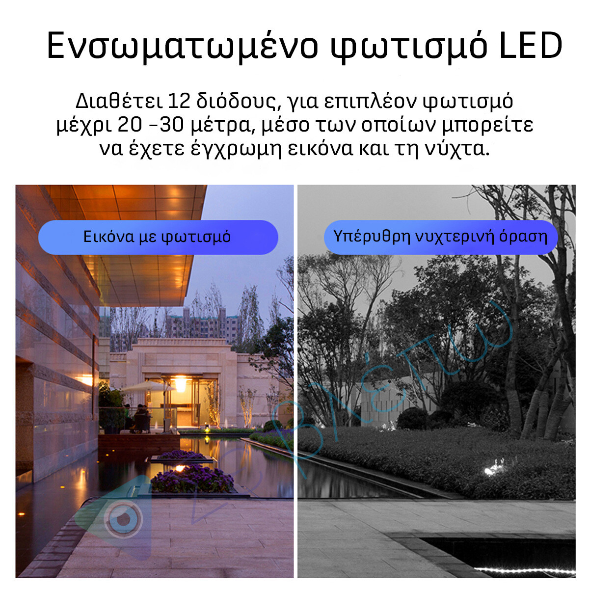 Η κάμερα είναι εξοπλισμένη με υπέρυθρη (IR) νυχτερινή όραση. Όταν οι φωτεινές ενδείξεις είναι σκοτεινές ή σβηστές, η κάμερα μεταβαίνει αυτόματα σε νυχτερινή λειτουργία (ασπρόμαυρη) και σας επιτρέπει να την δείτε, ακόμη και στο σκοτάδι.